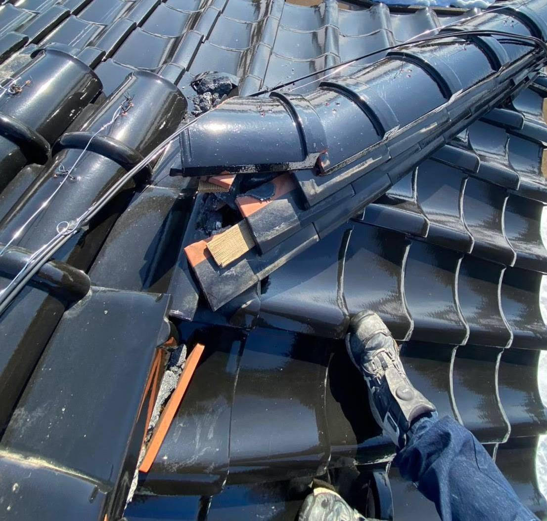 また、写真のように棟内部の木材や補強材の状態も確認し、必要に応じて補強・交換を実施。棟瓦の再設置時には高さや通りを丁寧に調整し、ズレや崩れが起きにくい構造へと仕上げています。さらに固定方法も見直し、強風や地震にも耐えられるよう配慮しました。見た目の美しさだけでなく、内部からしっかりと改善することで、長期的に安心できる屋根へと仕上げています。